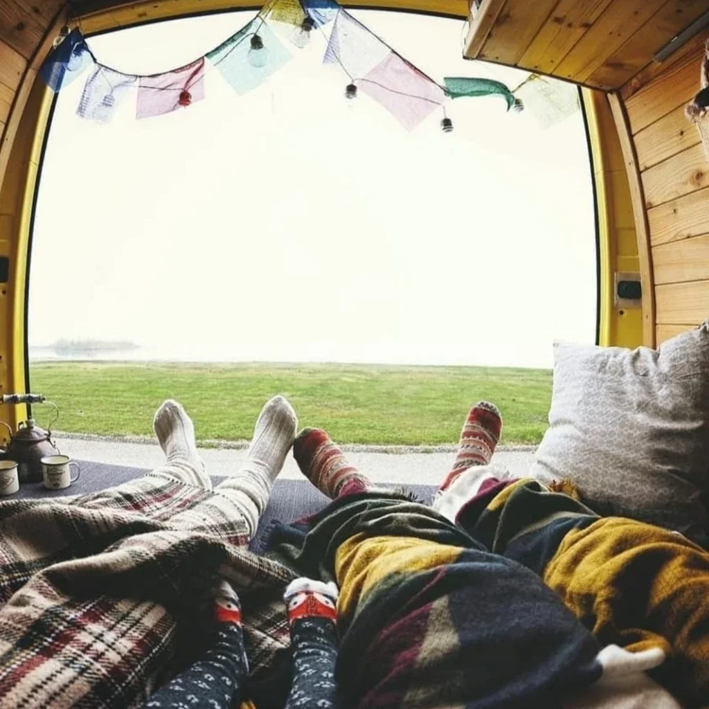 Imagine waking up not to an alarm, but to birdsong or sunlight on your face. The kids are still sound asleep — and based on what our guests tell us, children sleep surprisingly well in campervans — while you enjoy your morning coffee in complete silence, sitting on the van’s doorstep. No hotel checkouts, no rushing down for breakfast, no packed schedule pulling you out the door.